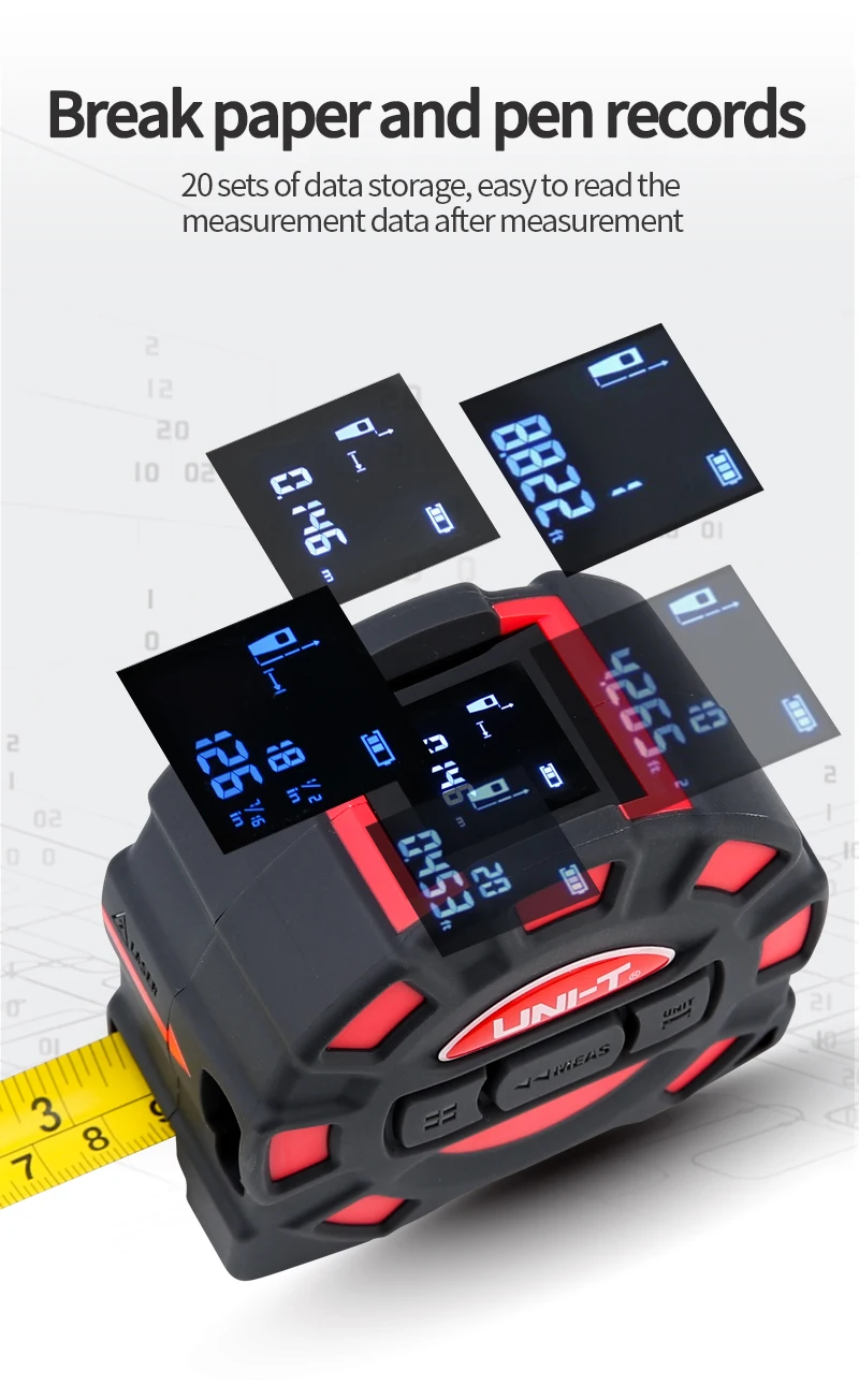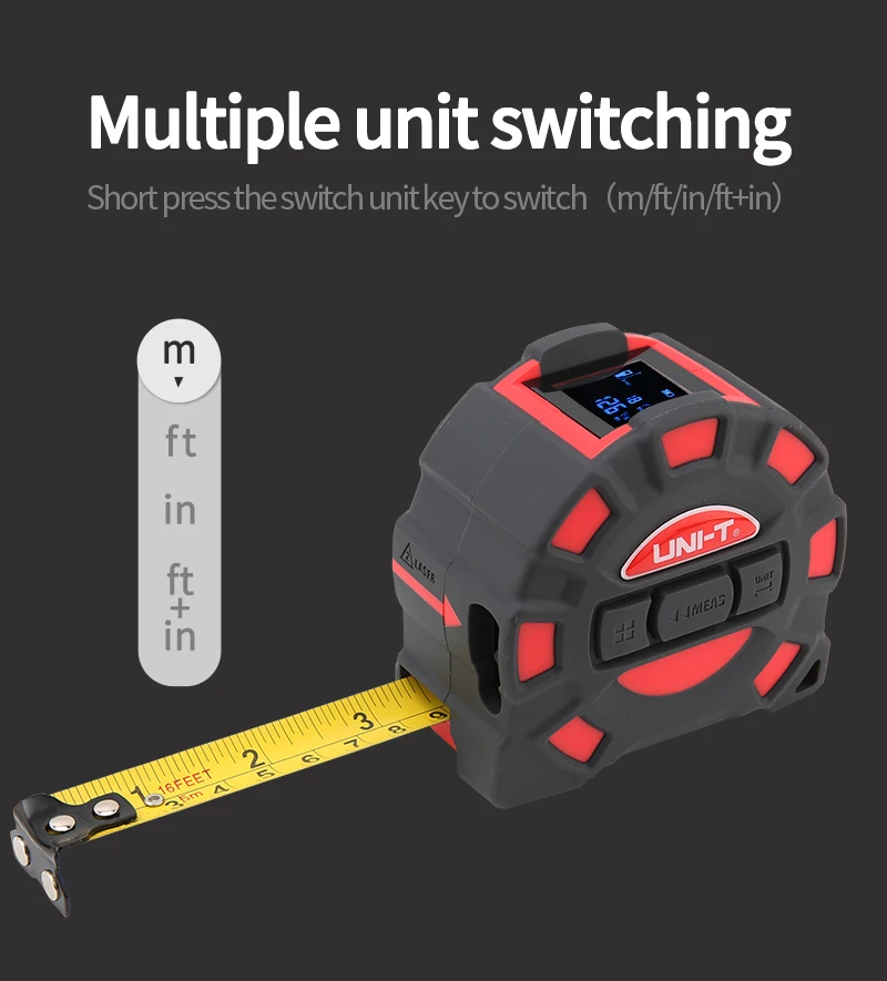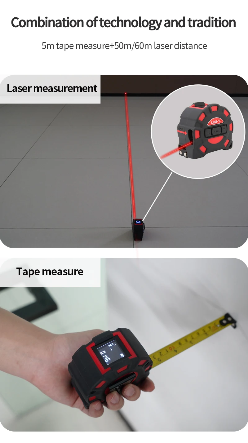 Mètre ruban laser UNI-T 2 en 1 50 m 60 m, télémètre à roulette, règle électronique avec écran LCD, outil de mesure