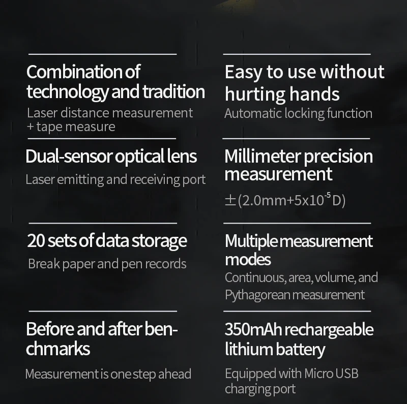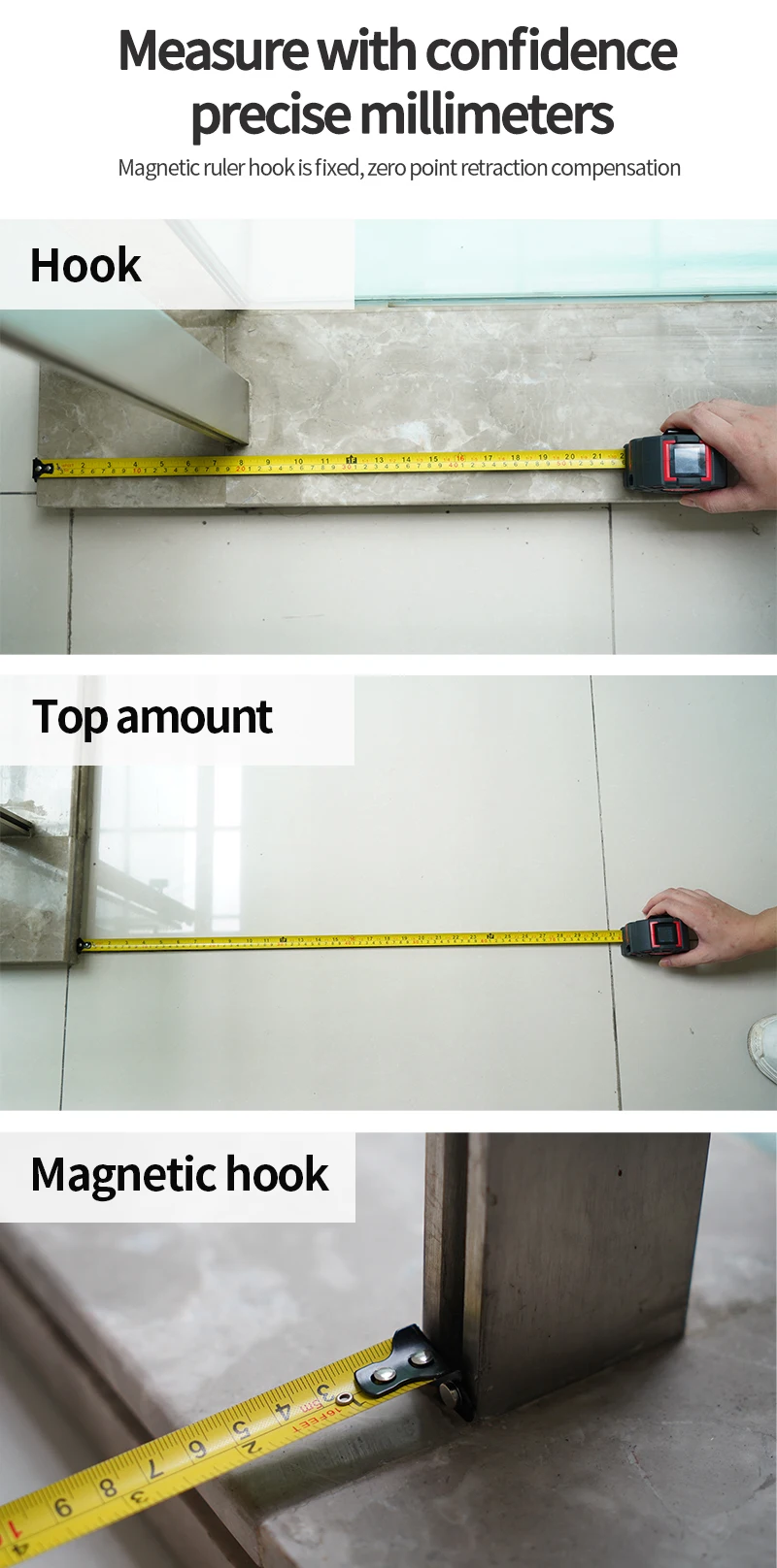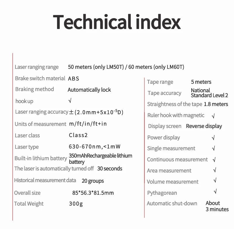 Le LM50T/LM60T est un outil multifonctionnel 2 en 1 combinant mesure au ruban et mesure laser. Ce produit est conforme à la norme de précision MID II. Il est doté d'une lame robuste d'une portée de 1,8 m. Il comprend également un crochet magnétique pour mesurer facilement les matériaux métalliques et un système de blocage du ruban pour un enroulement sécurisé.