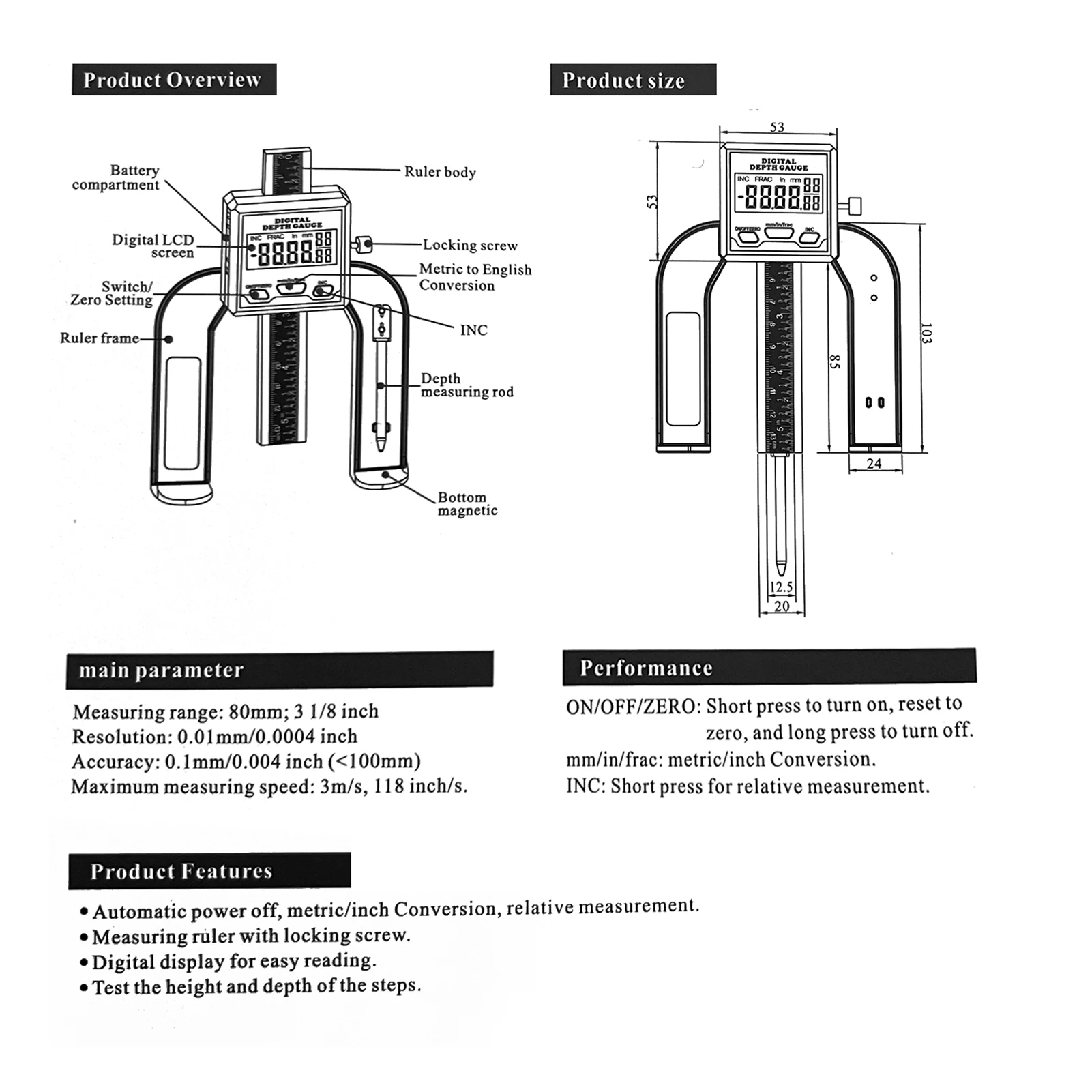 【Two Measurement Modes】: 0-80mm digital display depth gauge, with height and depth two measurement modes, you can switch according to your use needs.