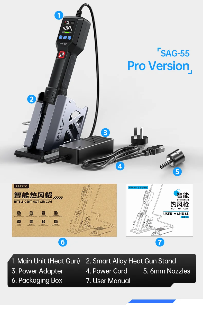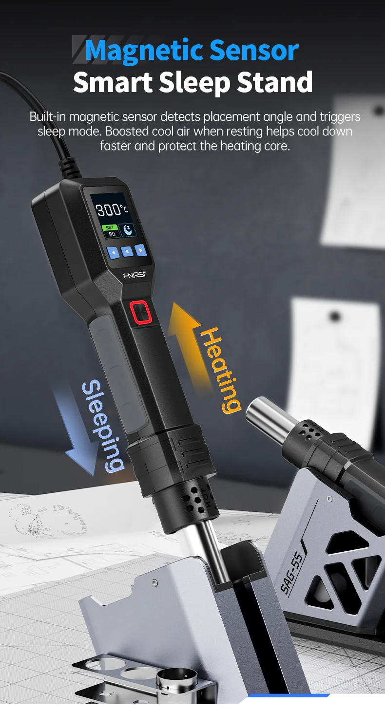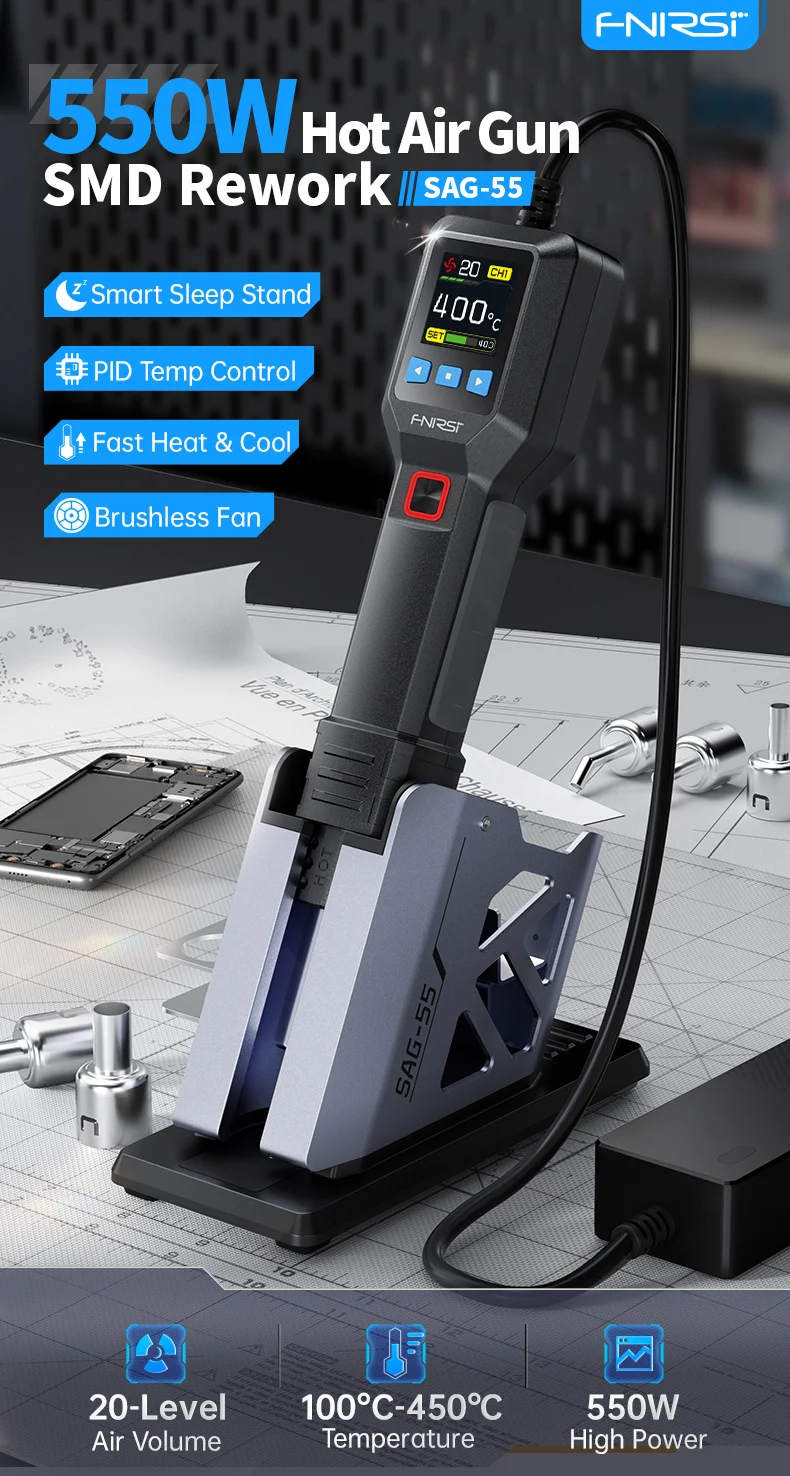 The SAG-55 Smart Hot Air Gun, developed by Shenzhen FNIRSI Technology Co., Ltd., is a compact, intelligent heat gun designed for a wide range of applications. It features microcontroller-based PID temperature control for fast heating with minimal thermal shock, protecting the heating element’s lifespan. A brushless fan with 20 adjustable speed levels ensures low noise and long service life, adaptable to various work environments.