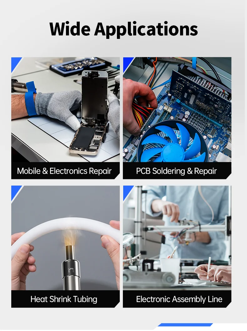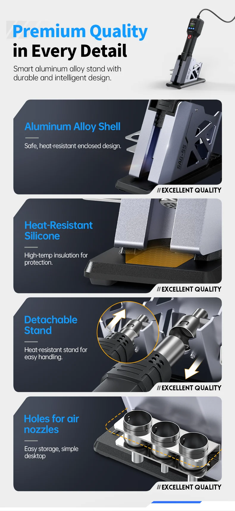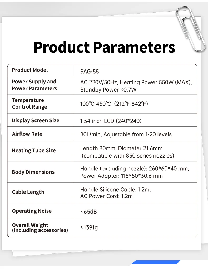 The rapid cooling function helps extend the heater’s life, while real-time monitoring sensors automatically shut off the heat in abnormal conditions for added safety. An LCD screen and LED indicator clearly show working status and temperature changes. With its comfortable grip and portable design, the SAG-55 is an ideal choice for both professionals and DIY users.