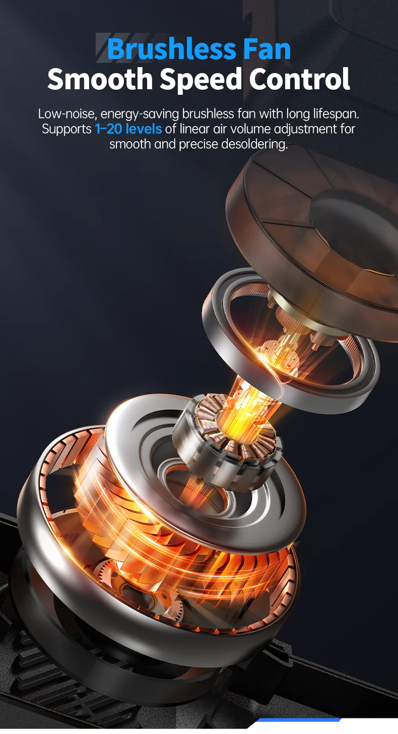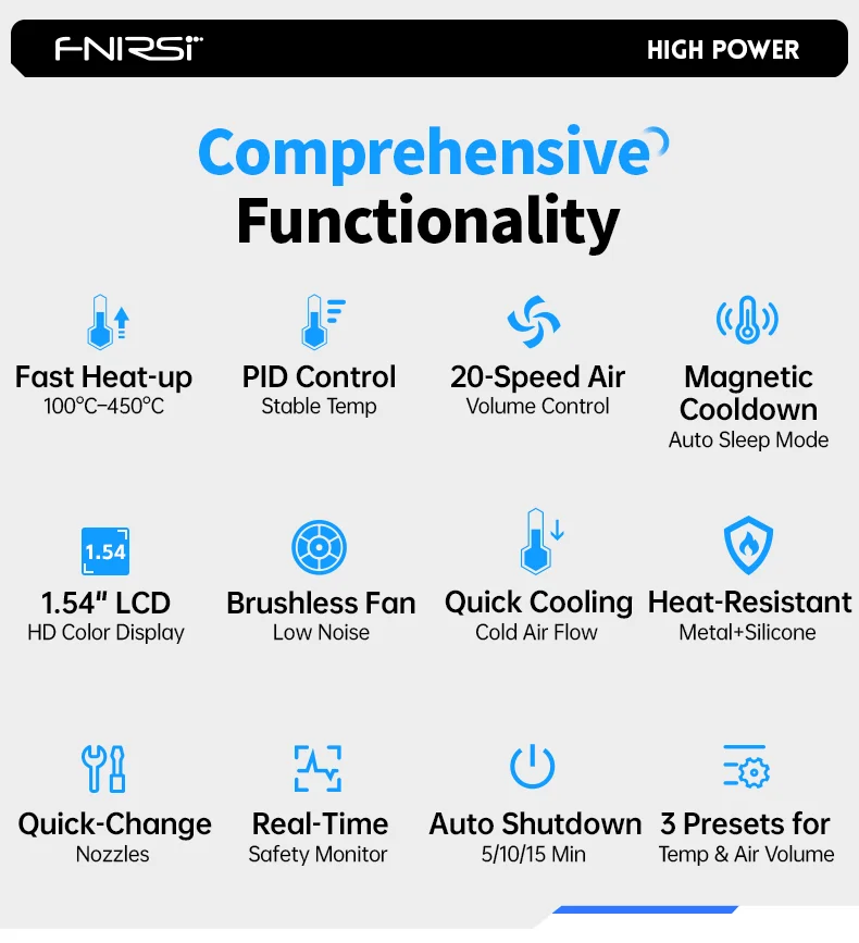 Quick Presets: Supports three quick temperature and airflow presets for easy switching. Adjustable airflow levels from 1 to 20 and temperature range from 100°C to 450°C.