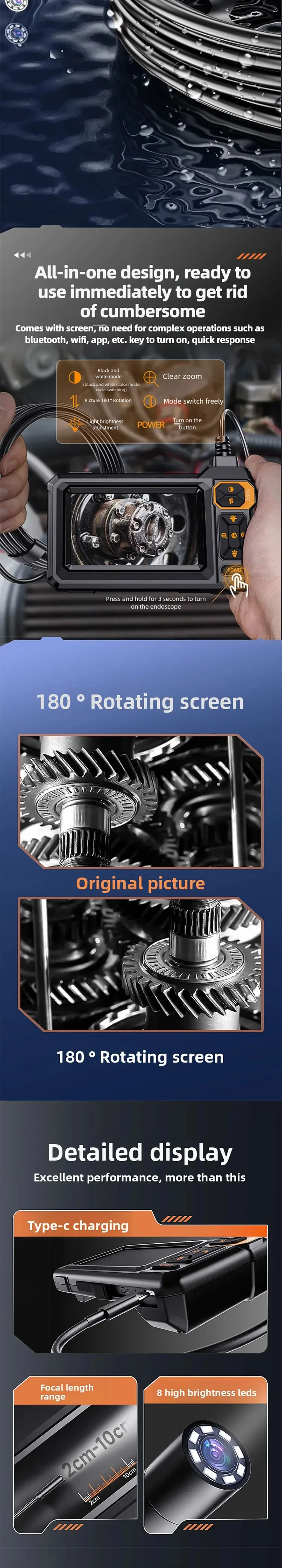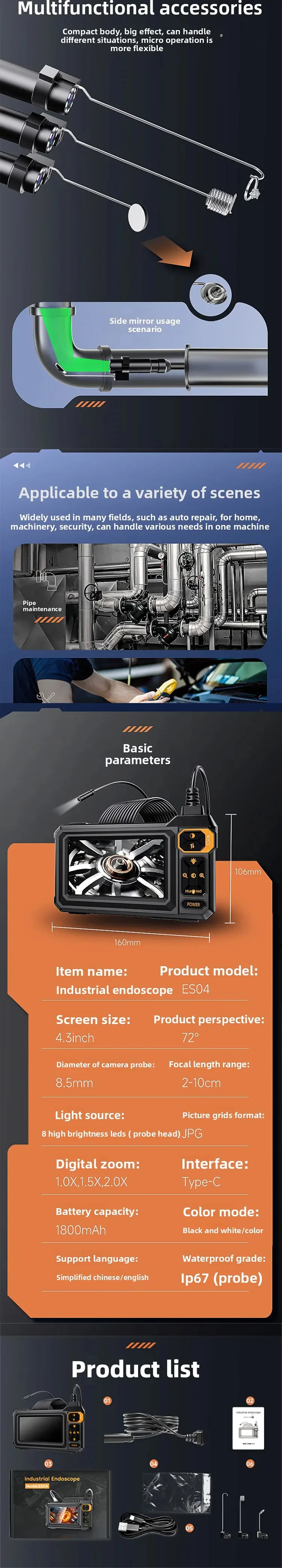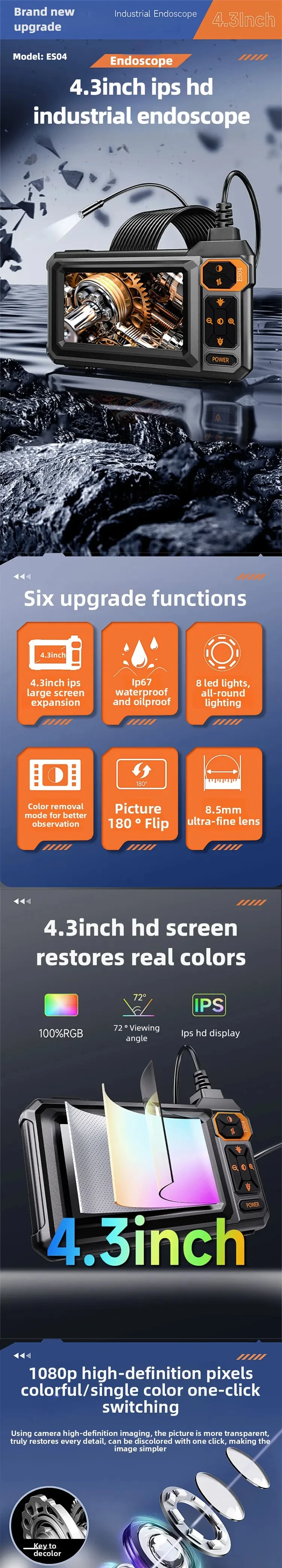 ndustrial Endoscope Camera 8mm HD1080P 4.3inch IPS Screen 16.5TF Pipe Inspection Camera for Car Repair IP67 Waterproof 8 LEDS